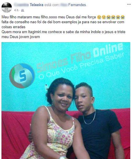 “Mataram meu filho, ôooo meu Deus, dai-me força. Falta de conselho não foi, dei bons exemplos já para não se envolver com coisas erradas. Quem me conhece sabe da minha índole. Ô jesus, é triste meu Deus, jovem, jovem”, esse desabafo foi feito, por meio do Facebook, pela moradora de Simões Filho, a comerciante Cosmira Teixeira, 38 anos, após receber a triste notícia da morte do filho, Alex Amaral Fernandes, 19 anos.
