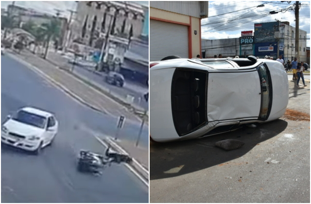 Câmeras de segurança flagraram todo o acidente. Com a colisão, condutora e garupa caíram no meio da pista após ter a moto arrastada pelo automóvel. Com o impacto da batida, o condutor do carro perdeu o controle da direção e o veículo capotou.